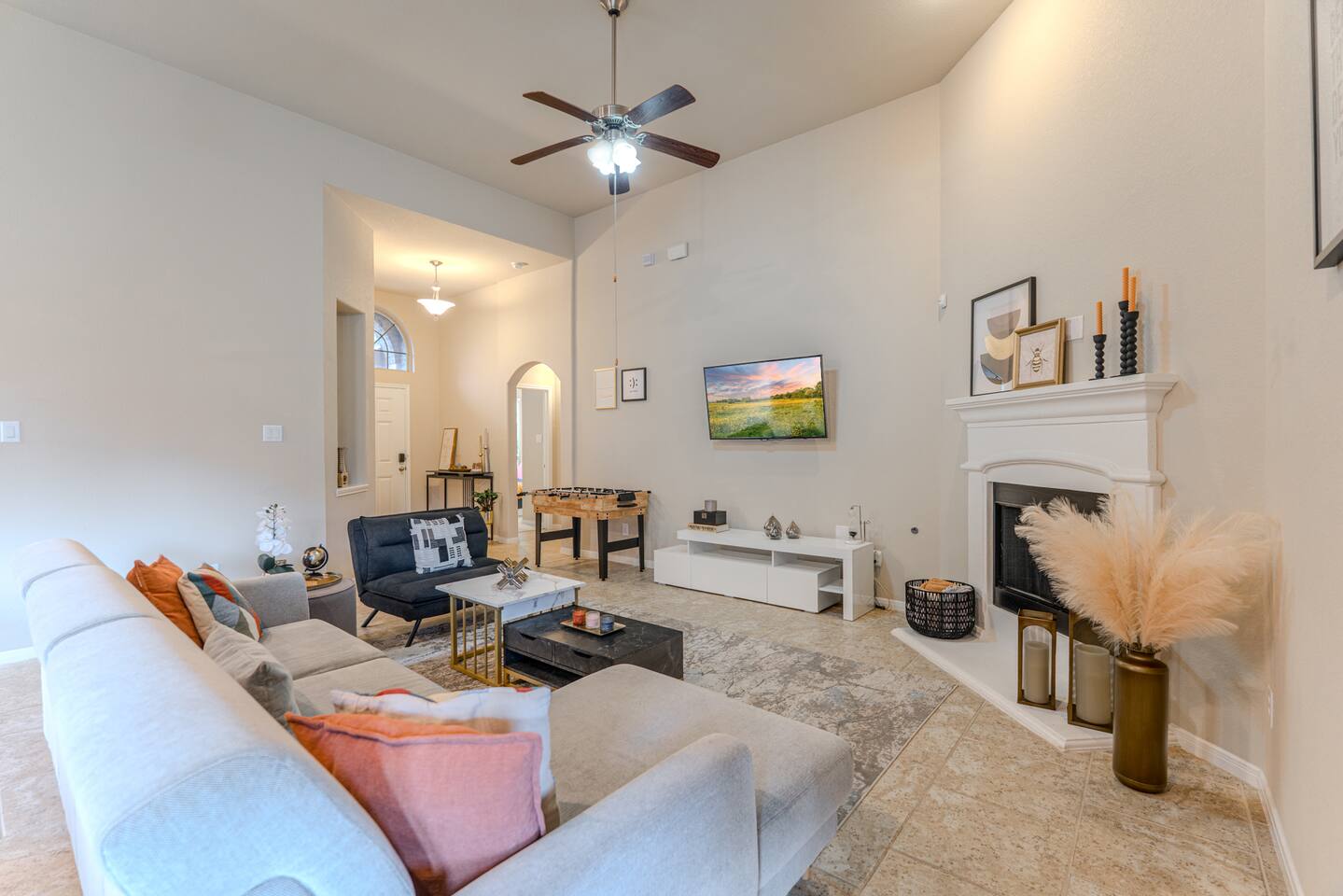 Enjoy a relaxing stay in our cozy home with great amenities: • 1 single story 1,587 sq ft • 3 bdr, 2 baths • Open-concept living area with natural light • Backyard with loungers & umbrella • Fast WiFi & cozy decor • Fits up to 9 guests • Located 1 block from The Woodlands/Creekside Village • Quick access to main roads, Target, Walmart, HEB, The Home Depot, shops, restaurants, movie theatres, golf, parks, community pools and much more! Come and enjoy your stay hosted by a Super Host!