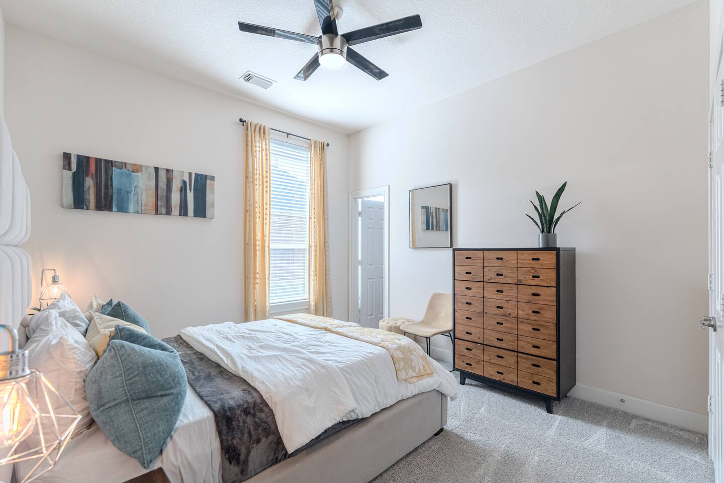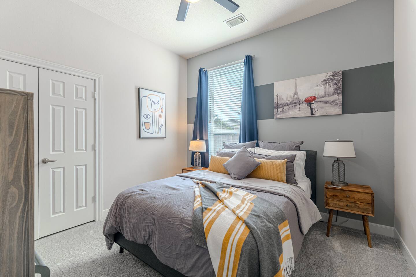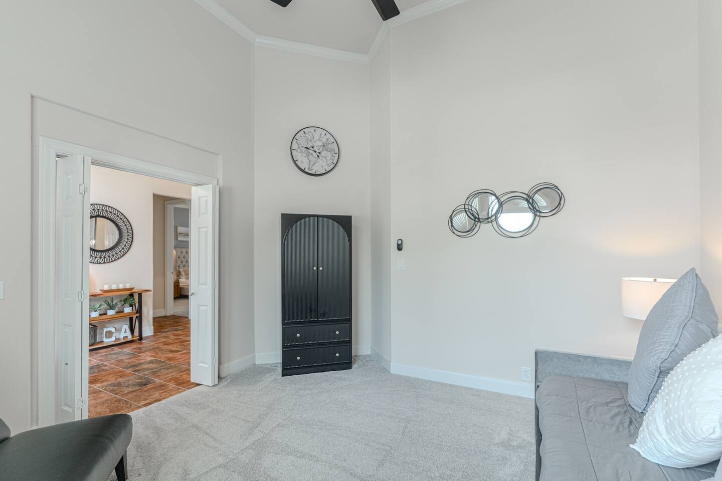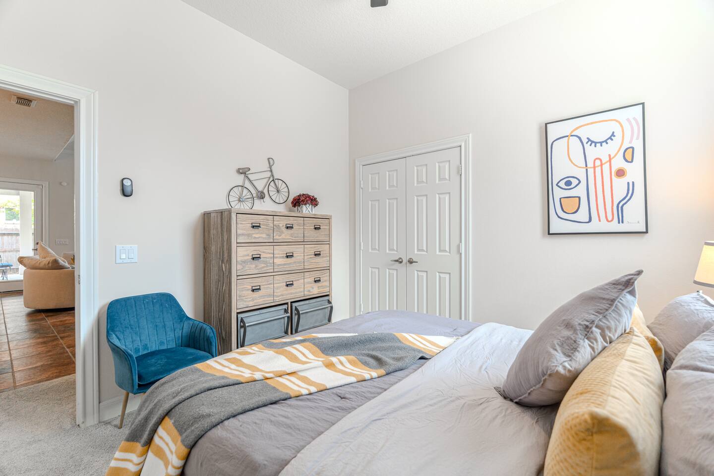 🏡 This spacious, well-equipped 1 story home is designed for comfort, functionality, and group stays! 🛋️ Open-concept living area with high ceilings and natural light 🍽️ Fully equipped kitchen with large dining area (sits 8) 🛏️ BEDROOMS (all downstairs, single story home): Main bedroom – King bed with ensuite bathroom Bedroom 2 – Queen bed (shared bath with #3) Bedroom 3 – Queen bed (shared bath with #2) Bedroom 4 – Queen bed (no bathroom) Studio - 2 twin beds (trundle) 📺 Cozy living room w large TV for movie nights 💻 Home office with fast WiFi 🛏️ Carpeted bedrooms & ceramic tyle in common areas 🚗 2-car garage + driveway space for 4 more cars
