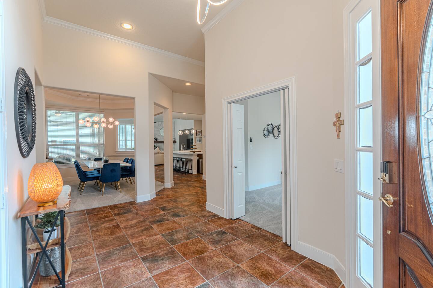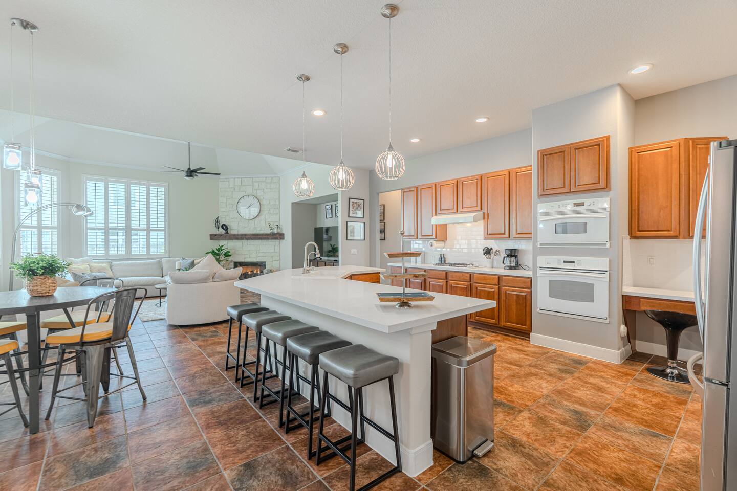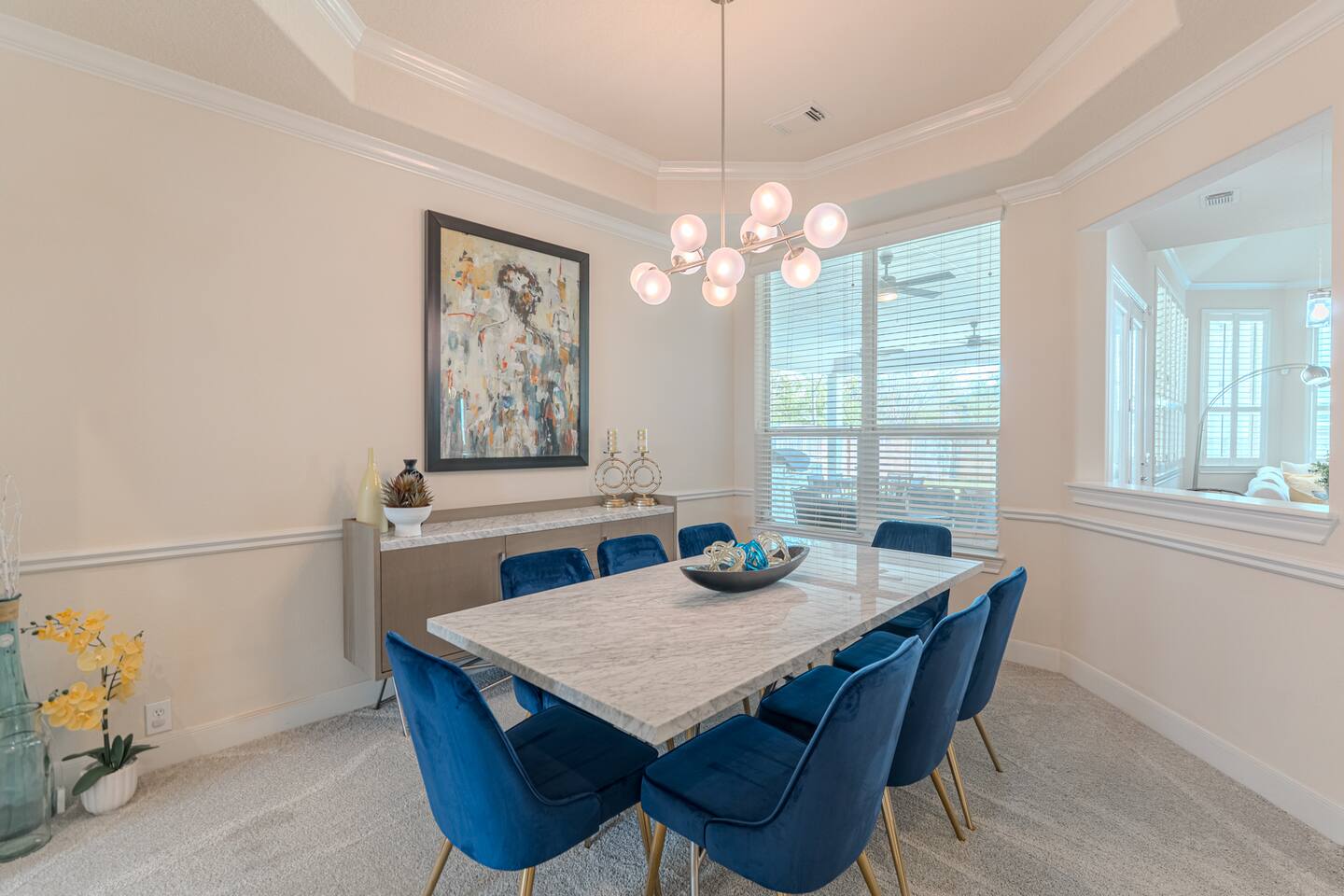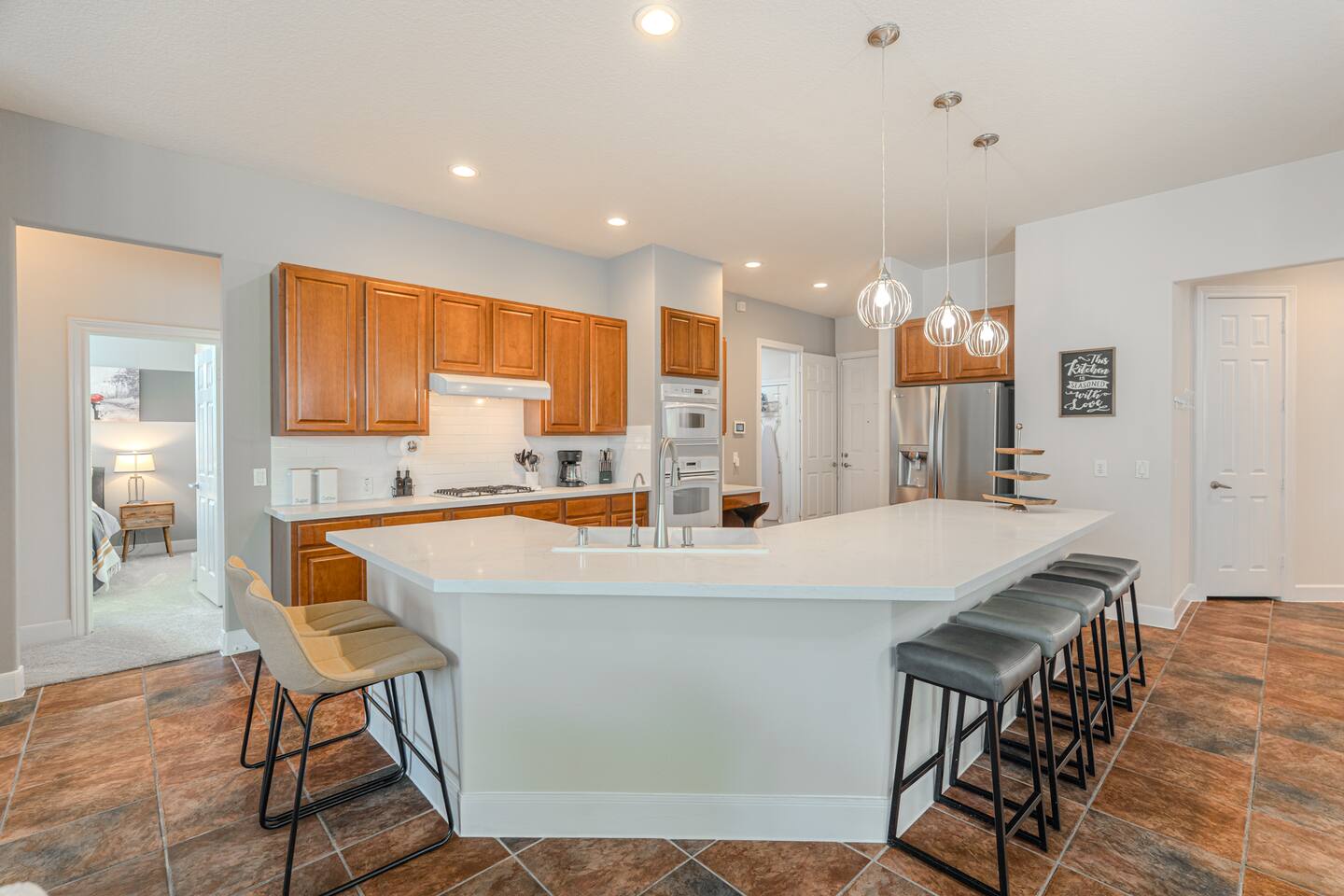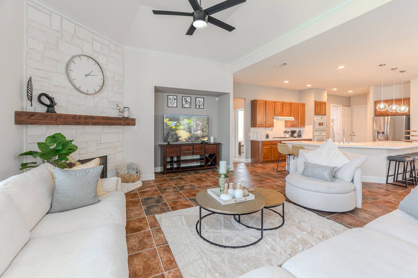 🏡 This spacious, well-equipped 1 story home is designed for comfort, functionality, and group stays! 🛋️ Open-concept living area with high ceilings and natural light 🍽️ Fully equipped kitchen with large dining area (sits 8) 🛏️ BEDROOMS (all downstairs, single story home): Main bedroom – King bed with ensuite bathroom Bedroom 2 – Queen bed (shared bath with #3) Bedroom 3 – Queen bed (shared bath with #2) Bedroom 4 – Queen bed (no bathroom) Studio - 2 twin beds (trundle) 📺 Cozy living room w large TV for movie nights 💻 Home office with fast WiFi 🛏️ Carpeted bedrooms & ceramic tyle in common areas 🚗 2-car garage + driveway space for 4 more cars