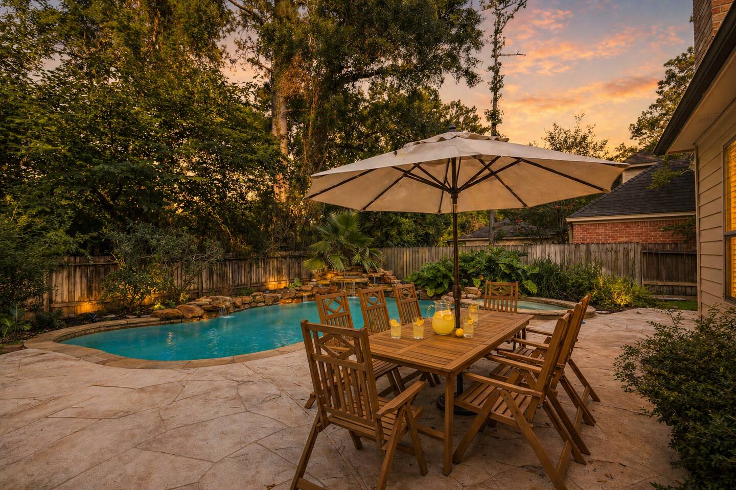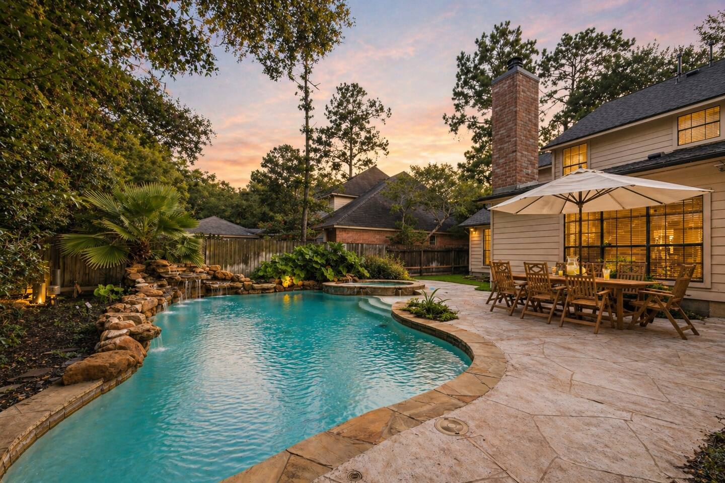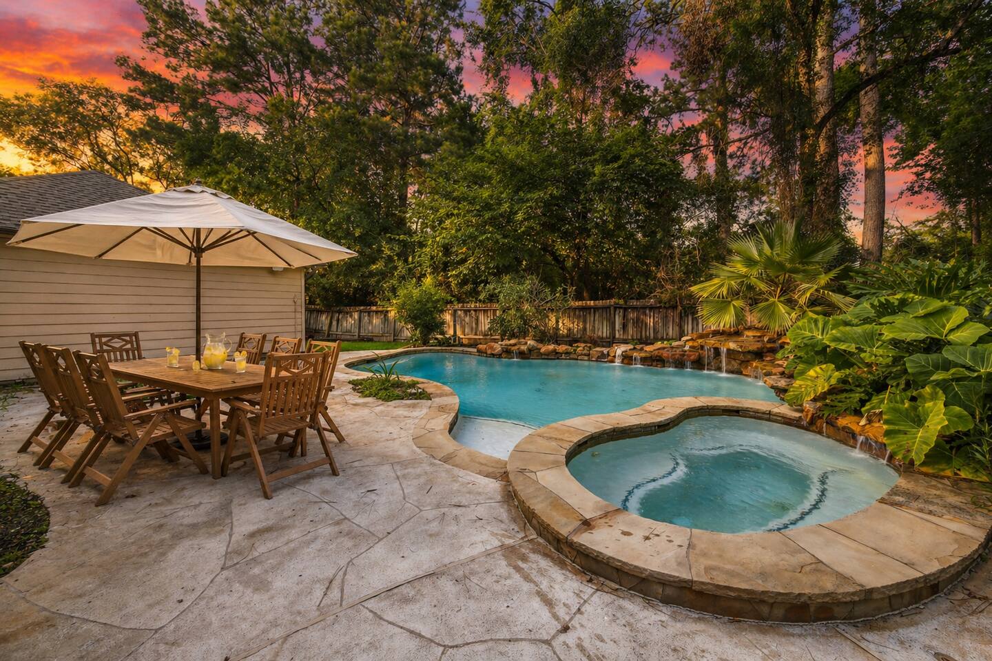 A private pool & spa retreat designed for comfort, privacy, and effortless living—nestled in the heart of The Woodlands. 🌿Wake up to a quiet, tree-lined setting, natural light filling the home, and step outside to your own backyard escape—coffee in hand, pool glistening, and total calm around you. Days are best spent poolside or enjoying the spa, while evenings bring everyone together—outdoor dining under the umbrella, a relaxed dinner inside, or winding down in the oversized TV room or fireplace. This is the kind of place that feels easy, private, and well put together from the moment you arrive. 🌴Backyard Retreat • Private pool + spa with natural stone waterfall feature • Spacious patio with outdoor dining area • BBQ grill • Fully fenced backyard surrounded by mature trees for privacy • Pool & Spa heating available (extra cost) 🏠 Designed for Families & Groups • 4 bedrooms | Comfortable for families or small groups • 3.5 bathrooms for convenience and flow • Two living areas, including an oversized TV room • Functional layout with separation between gathering and rest spaces 🛏️ SLEEPING ARRANGEMENTS Downstairs • Main bedroom — King bed + en-suite bathroom + TV Upstairs • Bedroom 2 — 2 Single beds + TV • Bedroom 3 — 2 Single beds + TV • Bedroom 4 — Queen bed + TV + en-suite bathroom • Shared bathroom for bedrooms 2-3 ✔ Sleeps up to 8 guests comfortably 🛋️ Comfortable & Open Living • Bright, open-concept main living area • Half bathroom • Large windows bringing in natural light • Fully equipped kitchen for short or extended stays • Dining areas for both indoor and outdoor meals 💻 Stay Connected • Fast WiFi for streaming and remote work • Smart TVs for entertainment • Plenty of space to work or relax comfortably 📍 LOCATION Located in a quiet, established neighborhood in The Woodlands surrounded by trees and greenbelt areas. Approximate drive times: • 5–7 min to The Woodlands Town Center • 5–7 min to The Woodlands Mall • 5-7 min to Cynthia Woods Mitchell Pavilion • 15–20 min to ExxonMobil Campus • Easy access to major roads (I-45) while maintaining a peaceful setting Whether you're here for a relaxing getaway, family time, or an extended stay, this home offers a private, well-located retreat hosted by a trusted Superhost.
