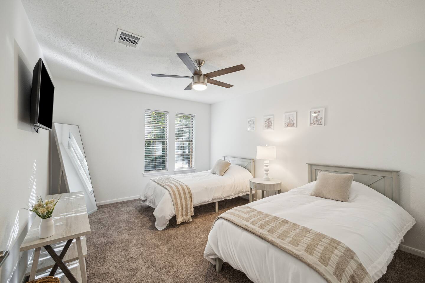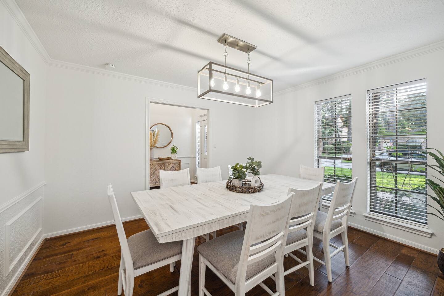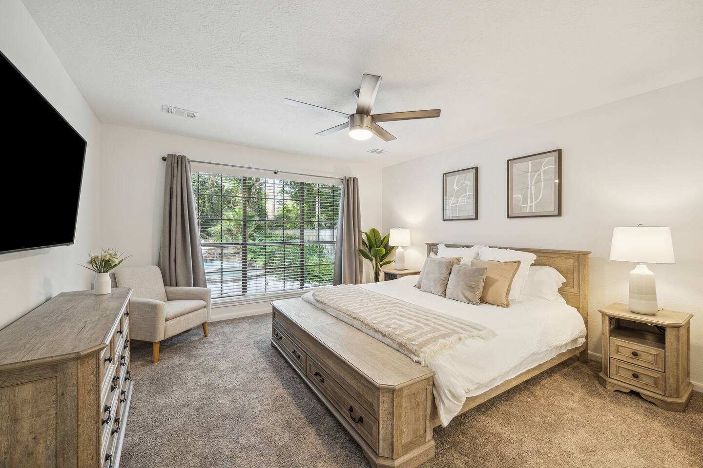 A private pool & spa retreat designed for comfort, privacy, and effortless living—nestled in the heart of The Woodlands. 🌿Wake up to a quiet, tree-lined setting, natural light filling the home, and step outside to your own backyard escape—coffee in hand, pool glistening, and total calm around you. Days are best spent poolside or enjoying the spa, while evenings bring everyone together—outdoor dining under the umbrella, a relaxed dinner inside, or winding down in the oversized TV room or fireplace. This is the kind of place that feels easy, private, and well put together from the moment you arrive. 🌴Backyard Retreat • Private pool + spa with natural stone waterfall feature • Spacious patio with outdoor dining area • BBQ grill • Fully fenced backyard surrounded by mature trees for privacy • Pool & Spa heating available (extra cost) 🏠 Designed for Families & Groups • 4 bedrooms | Comfortable for families or small groups • 3.5 bathrooms for convenience and flow • Two living areas, including an oversized TV room • Functional layout with separation between gathering and rest spaces 🛏️ SLEEPING ARRANGEMENTS Downstairs • Main bedroom — King bed + en-suite bathroom + TV Upstairs • Bedroom 2 — 2 Single beds + TV • Bedroom 3 — 2 Single beds + TV • Bedroom 4 — Queen bed + TV + en-suite bathroom • Shared bathroom for bedrooms 2-3 ✔ Sleeps up to 8 guests comfortably 🛋️ Comfortable & Open Living • Bright, open-concept main living area • Half bathroom • Large windows bringing in natural light • Fully equipped kitchen for short or extended stays • Dining areas for both indoor and outdoor meals 💻 Stay Connected • Fast WiFi for streaming and remote work • Smart TVs for entertainment • Plenty of space to work or relax comfortably 📍 LOCATION Located in a quiet, established neighborhood in The Woodlands surrounded by trees and greenbelt areas. Approximate drive times: • 5–7 min to The Woodlands Town Center • 5–7 min to The Woodlands Mall • 5-7 min to Cynthia Woods Mitchell Pavilion • 15–20 min to ExxonMobil Campus • Easy access to major roads (I-45) while maintaining a peaceful setting Whether you're here for a relaxing getaway, family time, or an extended stay, this home offers a private, well-located retreat hosted by a trusted Superhost.